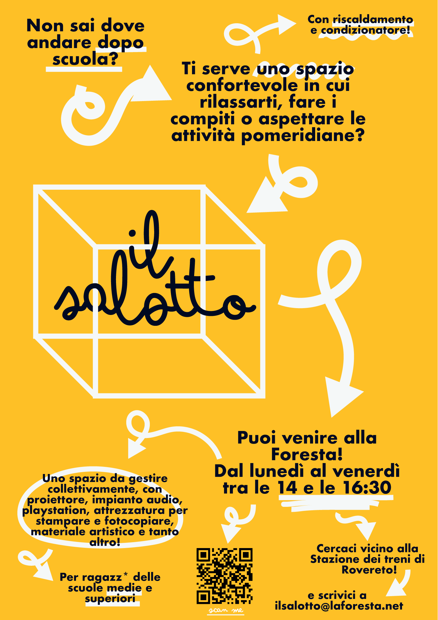 Gli spazi del "Salotto" potranno essere utilizzati in maniera libera in condivisione con le persone che frequentano la Foresta, ad esempio per fare comunità, leggere, giocare, fare i compiti e guardare un film.