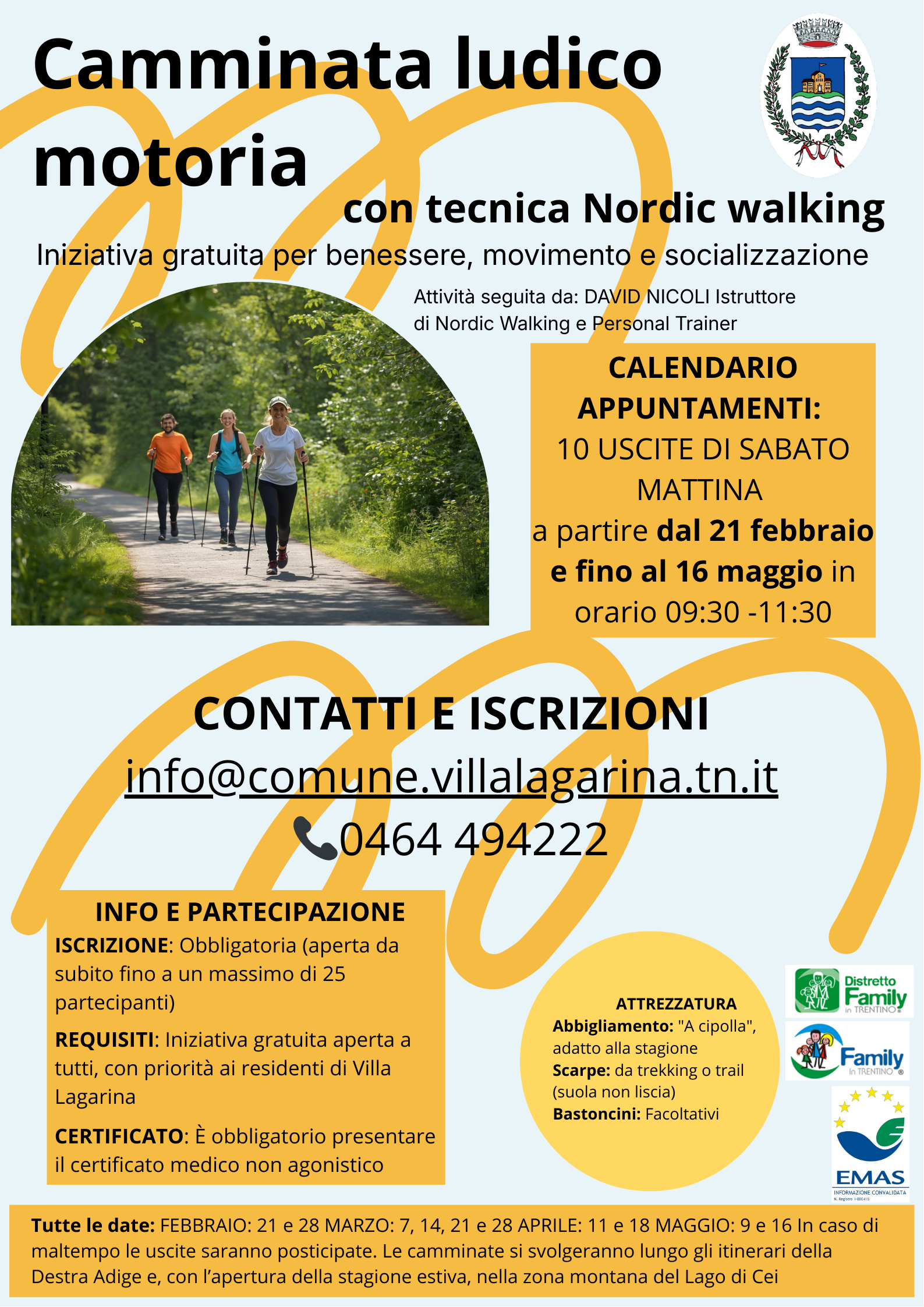 Il Comune di Villa Lagarina promuove un nuovo ciclo di 10 appuntamenti dedicati al benessere e alla socializzazione attraverso la camminata ludico-motoria con tecnica Nordic Walking. Sotto la guida esperta di David Nicoli (Istruttore NW e Personal Trainer), i partecipanti potranno scoprire la bellezza del nostro territorio, percorrendo gli itinerari della Destra Adige e della zona montana del Lago di Cei. L'iniziativa è completamente gratuita e aperta a tutti i cittadini, con priorità di iscrizione riservata ai residenti di Villa Lagarina. Per partecipare è richiesto il certificato medico non agonistico e la prenotazione obbligatoria (massimo 25 posti).