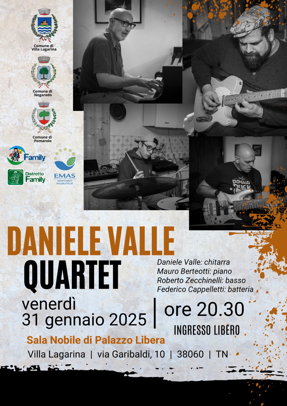 Non mancare all'evento musicale di Daniele Valle QUARTET venerdì 31 gennaio 2025 alle ore 20.30 presso Sala Nobile sita in Palazzo Libera, via Garibaldi, 10 - Villa Lagarina. L'ingresso è libero.