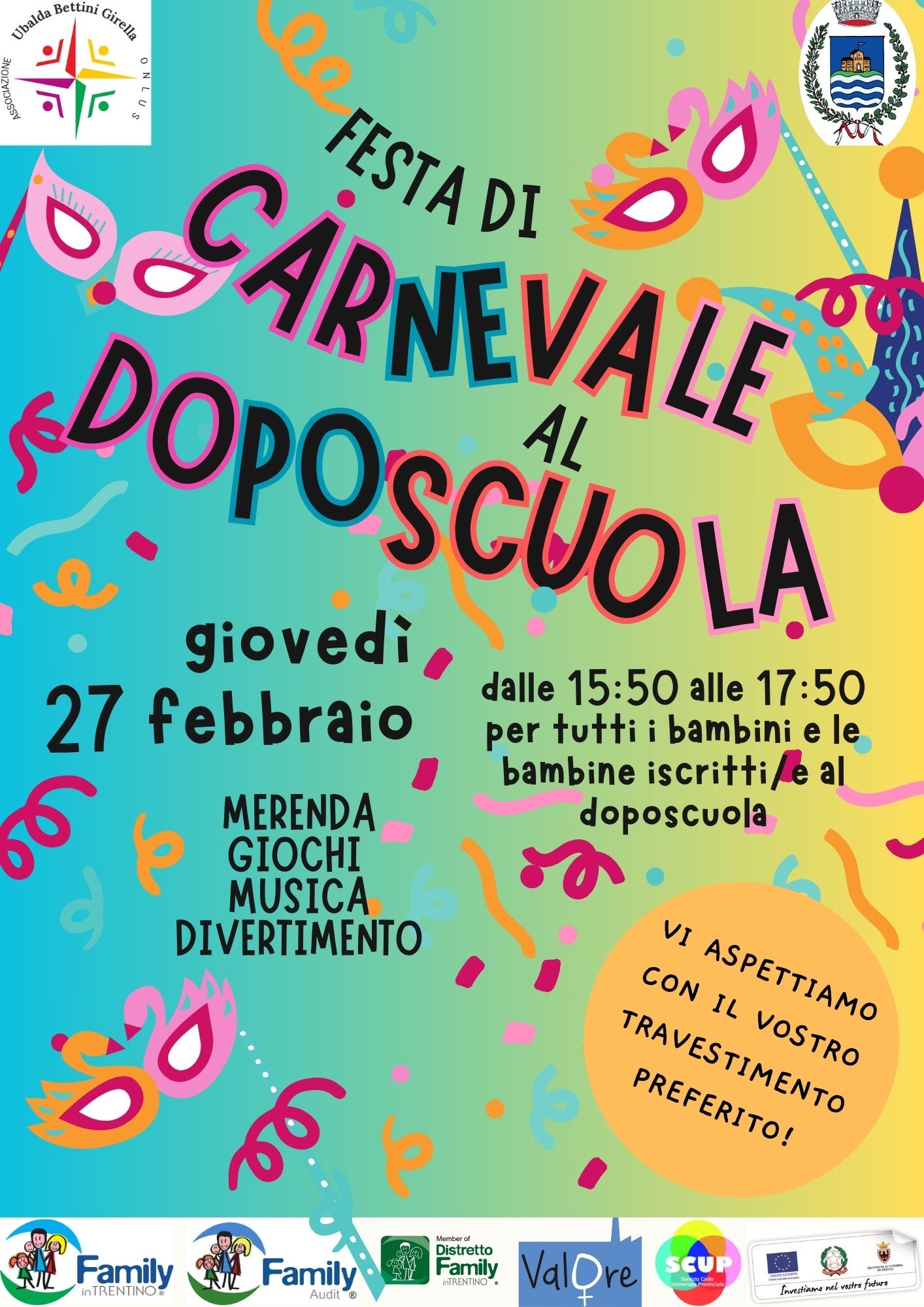 L'Associazione Ubalda Bettini Girella è lieta di invitare tutte le bambine ed i bambini iscritti/e al doposcuola alla festa di carnevale!